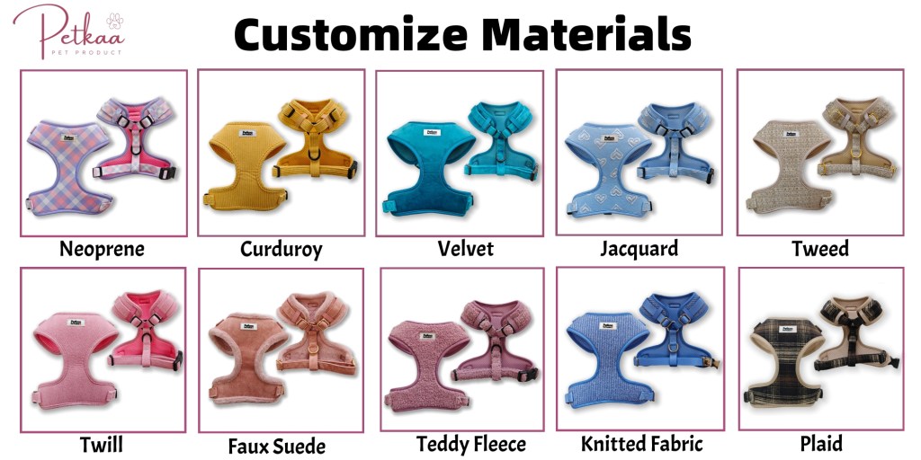 This adjustable and step-in pet harness set offers the perfect balance of design flexibility, comfort, and brand customization. It allows pet brands to create visually cohesive product lines while meeting the practical needs of pets and pet owners alike.