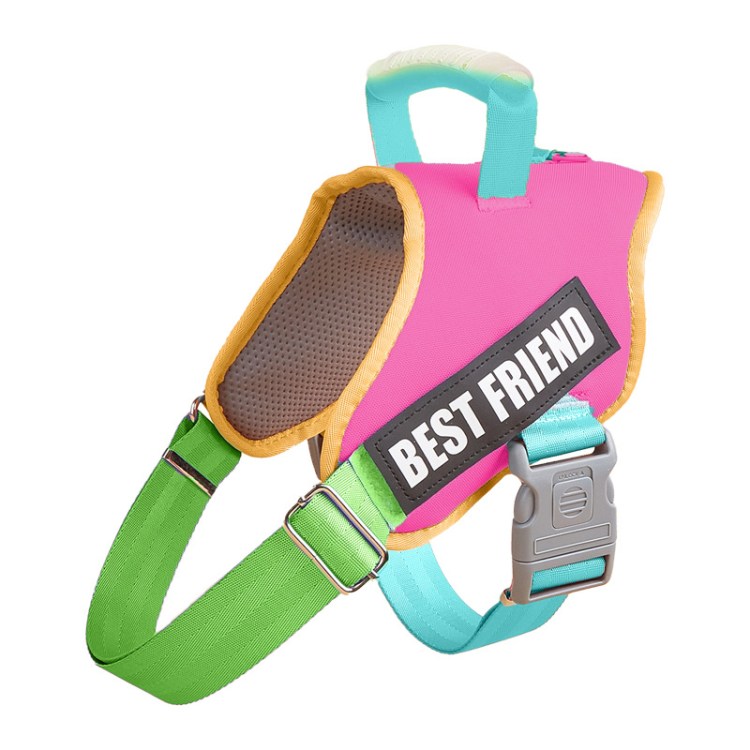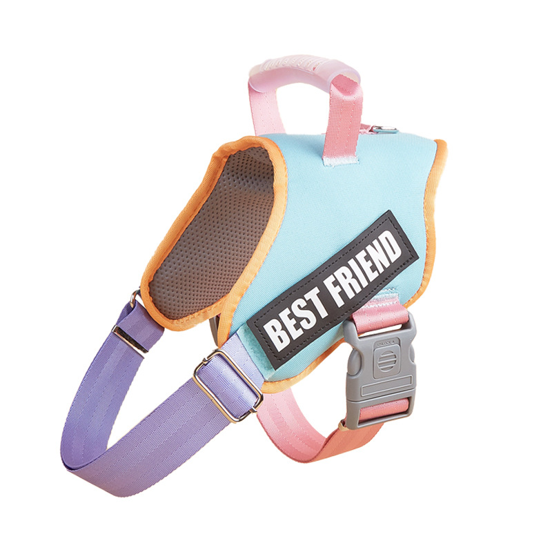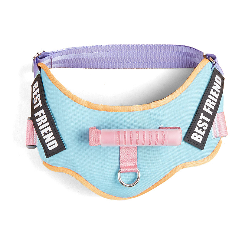 Petkaa dog vest harness HS022 is ideal for dogs of medium to big sizes. The stylish macaron colors are right in trend. The silicone grip handle help dog owners to better control their dogs easily without hurting their hands. Reflective strips around the vest make sure dogs are safe at night. The letters on the vest can be customized on your demand. High quality nylon ribbon is key to durability. Moreover, we specially use good quality metal D ring and extra-thick buckle to prolong its service life.