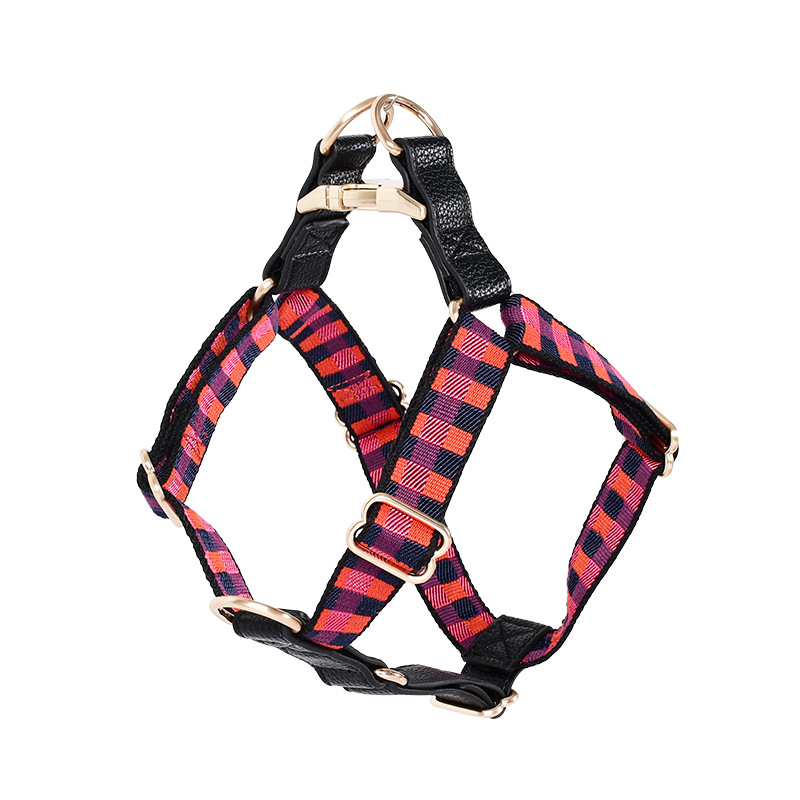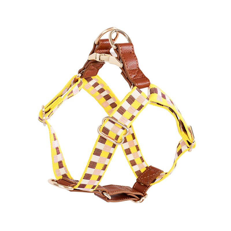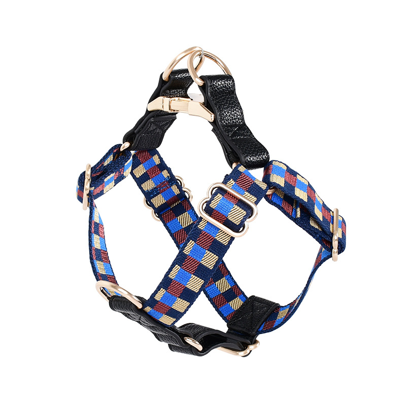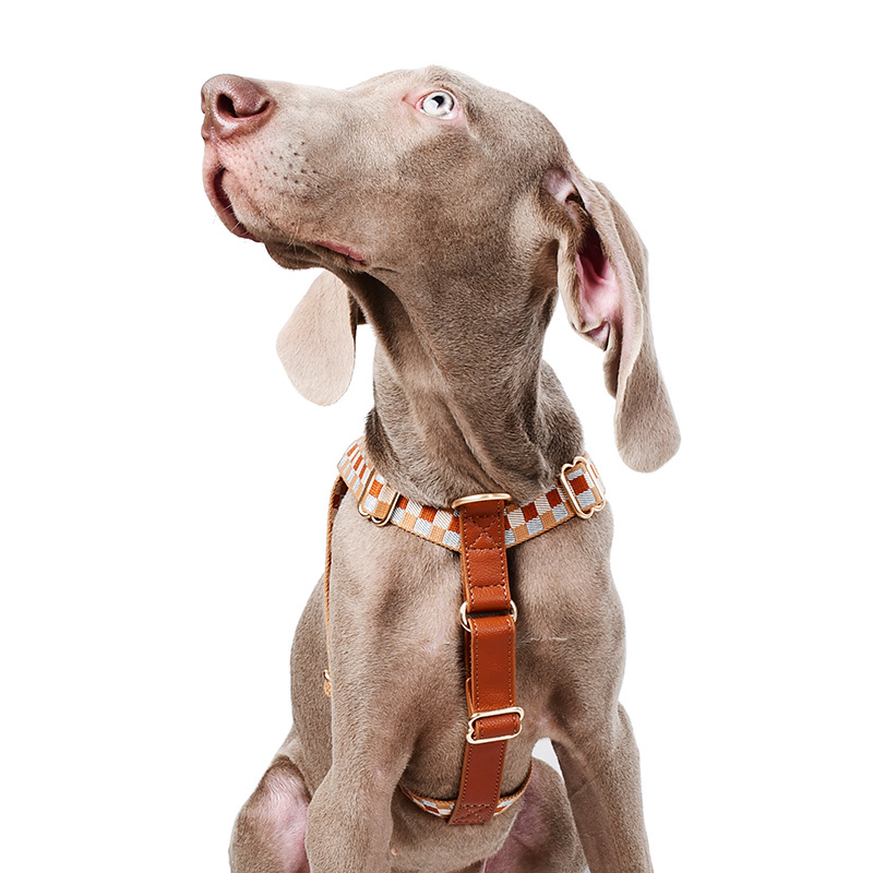Crafted from high-quality ECO leather and check patterned nylon brqaided strap , our harnesses provide a soft and gentle touch on your furry friend’s skin, making it ideal for everyday wear. This dog harness is designed for medium and large sized breeds, offering comfort and style in one delicate beautifully designed dog harness. The material is durable and long-lasting, ensuring that your customers’ beloved pets will be both comfortable and secure.
